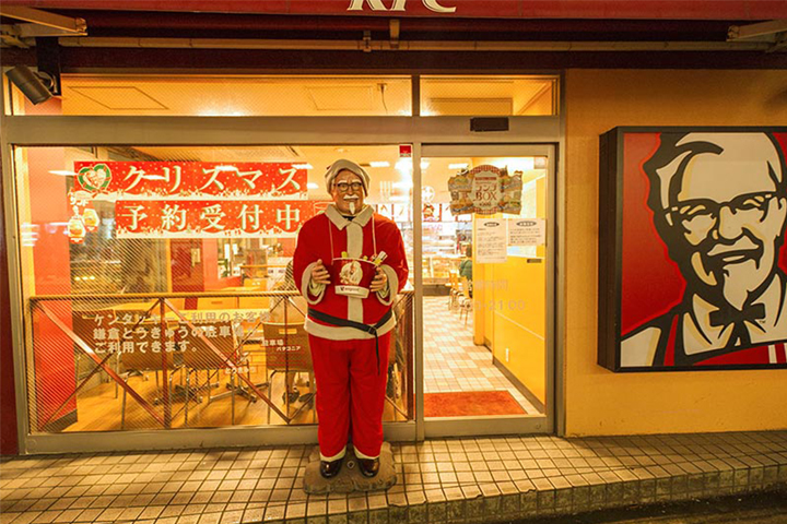 کریسمس در ژاپن هیچوقت آداب و رسوم ویژهای به جز هدیه دادن و نورافشانی نداشت. اما در سالهای اخیر، فعالیتهای جدیدی کم کم تبدیل به سنت در میان مردم شد؛ مانند سفارش مرغ سوخاری کنتاکی که کلنل ساندرز، موسس KFC، برای شام کریسمس ترتیب داده بود. سایتهای کی اف سی در ژاپن، منوی متنوعی برای جشن ارائه میدهد. حتی اگر زبان ژاپنی بلد نباشید، تصاویر تبلیغاتی آنقدر جذاب هستند که وسوسه شوید برای شام کریسمس، مرغ سوخاری کنتاکی سفارش بدهید