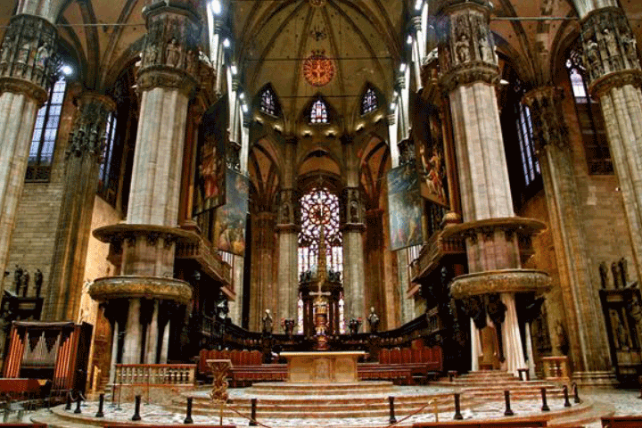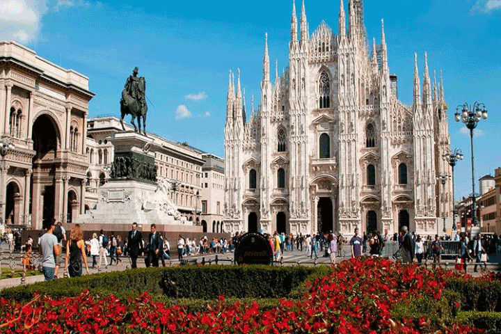 کلیسای جامع میلان یا دوموئو میلان وافع در میدان دلدوئومو است. هم اکنون چهارمین کلیسای بزرگ دنیاست ، در جای کنونی کلیسا ، قصری بزرگ از زمان امپراتوری روم قرار داشت که پس از یک آتش سوزی در سال 454 خورشیدی برابر با 1075 میلادی بی کاربرد ماند تا اینکه ساخت کلیسا در سال 765 خورشیدی برابر با 1386 میلادی آغاز شد.
